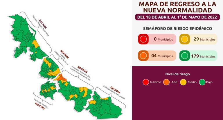 Del 18 de abril al 01 de mayo, Veracruz se mantiene en color verde (riesgo bajo) a nivel nacional; en la entidad, 4 municipios –La Antigua, Paso de Ovejas, Úrsulo Galván y Veracruz– están en naranja (alto), 29 en amarillo (medio) y 179 en verde.