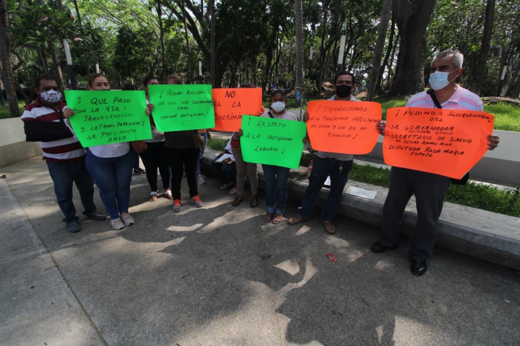Los quejosos se manifestaron presentando cartulinas dónde solicitaban el respeto a la antigüedad laboral; además señalaron que, ellos tuvieron que trabajar durante la pandemia, poniendo en riesgo la salud personal y la de su familia.