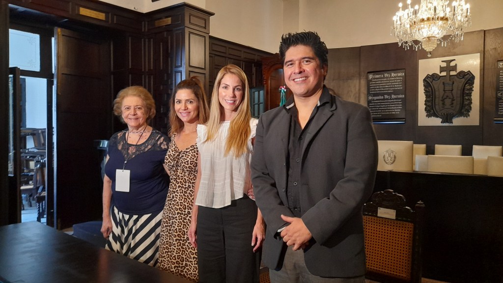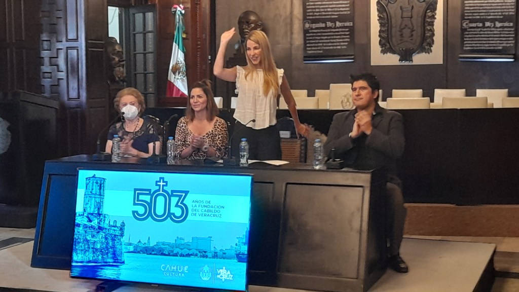 En el Cabildo del Ayuntamiento porteño ,la alcaldesa de Veracruz, Patricia Lobeira de Yunes en compañía de Israel Cahue director del proyecto Cahue cultura Gabriela Zamora Loyo,directora de cultura y recreación y Concepción Diaz Chazaro,cronista de la ciudad.,presentaron el programa cultural de los 503 años de festejo de la ciudad y Puerto de Veracruz.