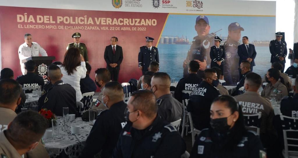 Durante la ceremonia celebrada en la Explanada del Centro de Estudios e Investigación en Seguridad Pública (CEIS), en la localidad de El Lencero, en el municipio de Emiliano Zapata, en representación del Gobernador del Estado, Cuitláhuac García Jiménez, el funcionario estatal hizo extensiva una felicitación a las y los policías estatales.