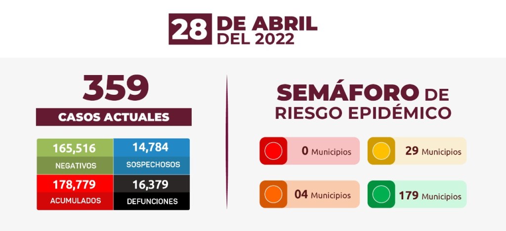*Xalapa, Ver.-* En las últimas 24 horas, Veracruz sumó 178 mil 779 (+ 71 nuevos) casos confirmados de COVID-19, luego de 359 mil 079 estudios practicados. Hay 359 positivos y 87 sospechosos activos, al tiempo que van 162 mil 042 pacientes recuperados y 358 permanecen en vigilancia.