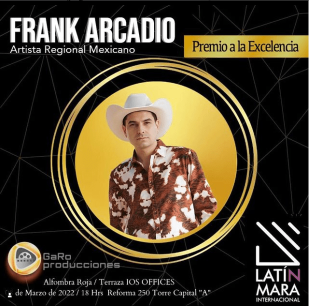 Frank Arcadio sigue posicionando su carrera como intérprete de la música Regional Mexicana, por su destacada contribución y amor a la cultura, producción y arte fue reconocido con el distinguido Latin Mara Internacional 2022, Premio A La Excelencia.