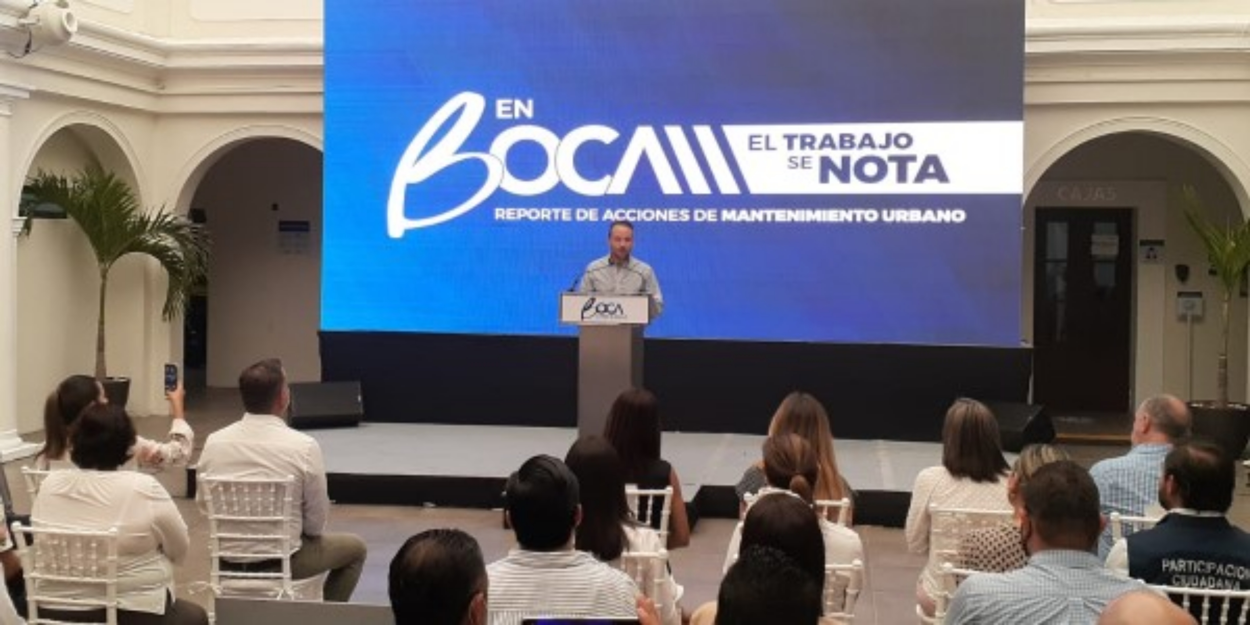 En el patio central del Ayuntamiento de Boca del Río,se llevó a cabo el reporte de acciones de mantenimiento urbano que se ha realizado en estos primeros 135 días de la administración que encabeza el alcalde, Juan Manuel Unánue.