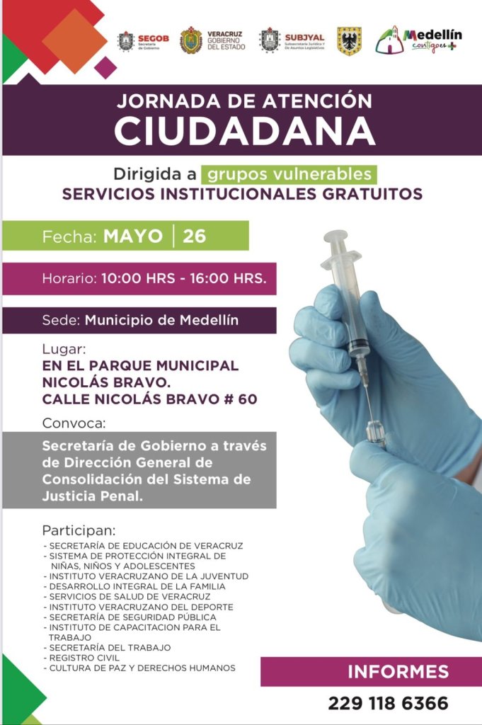 Medellín de Bravo, Ver.- El Ayuntamiento de Medellín de Bravo será sede la Jornada de Atención Ciudadana organizada por el Gobierno del Estado, en la cual se ofrecerán asesorías jurídicas, servicios médicos y capacitaciones para emprendedores, todos lo ofrecido será totalmente gratuito.