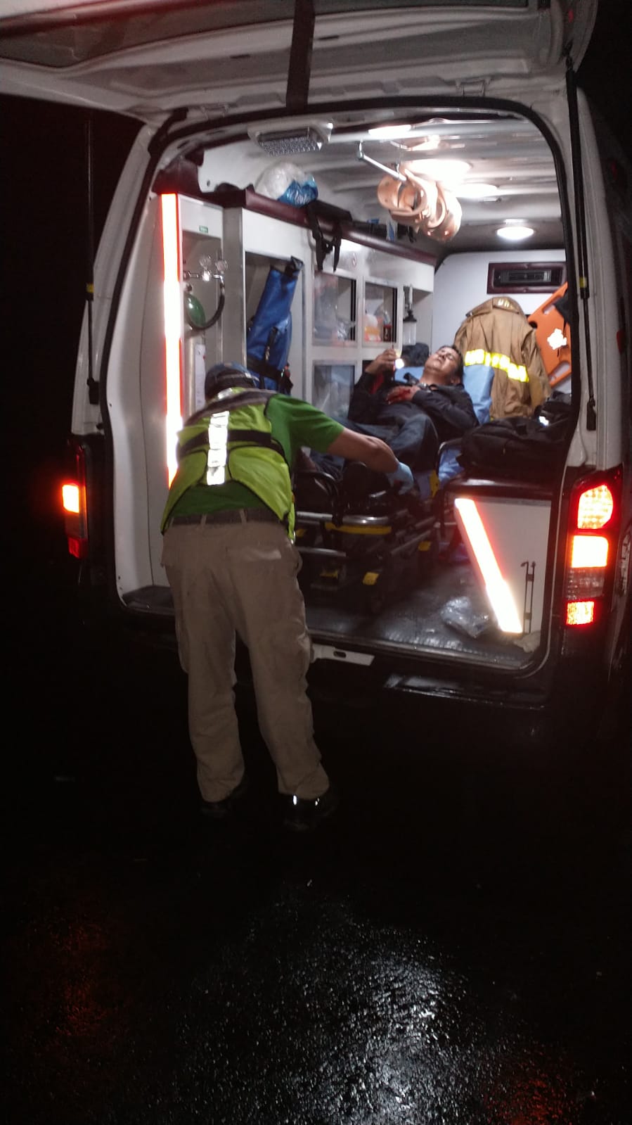 Paramédicos de Protección Civil municipal de Medellín de Bravo llegaron para brindarle los primeros auxilios al sobreviviente Rubén Daniel, quien resultó con una cortada en la mano y golpes contusos, así que fue llevado a un hospital.