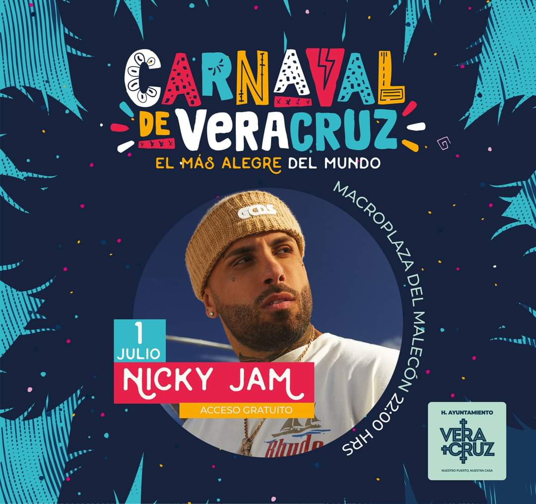 *Veracruz, Ver., 14 de junio de 2022.-* Este martes, la alcaldesa Patricia Lobeira de Yunes anunció que serán Nicky Jam, Yuri y Moderato los artistas que se presentarán en los conciertos masivos en la Macroplaza del Malecón durante los festejos del Carnaval 2022, el más alegre del mundo, a realizarse del 01 al 05 de julio.