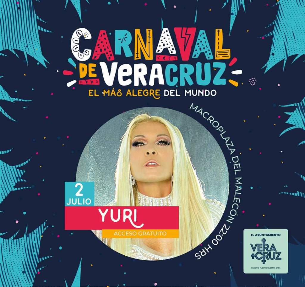 La jarocha consentida, Yuri, estará en el segundo masivo el sábado 02 de julio. Yuri fue reina del Carnaval en 1993 y debido a su exitosa trayectoria el Ayuntamiento y el Comité Organizador le hará un merecido homenaje.