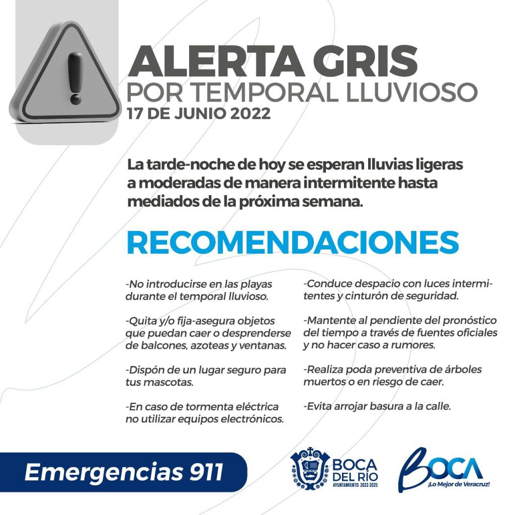 Por tal motivo, el Ayuntamiento de Boca del Río, que en encabeza el Alcalde Juan Manuel Unánue Abascal, emite una serie de recomendaciones a la ciudadanía, ya que se espera que a partir de la tarde-noche de este viernes, se presenten lluvias ligeras a moderadas de manera intermitente, manteniéndose hasta mediados de la próxima semana.