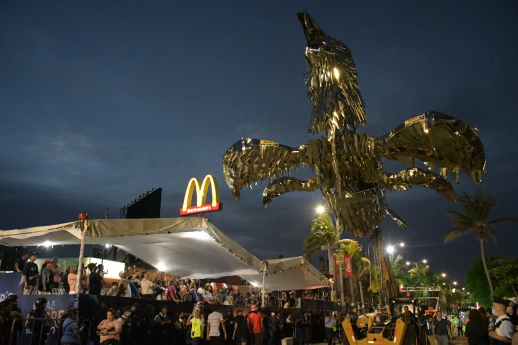 Los carros alegóricos, de los más vistosos, con figuras monumentales de 12 y 14 metros de altura, sin duda fueron la delicia de chicos y grandes; el Ave Fénix, el Quetzalcóalt echando humo de colores y un dinosaurio gigante.