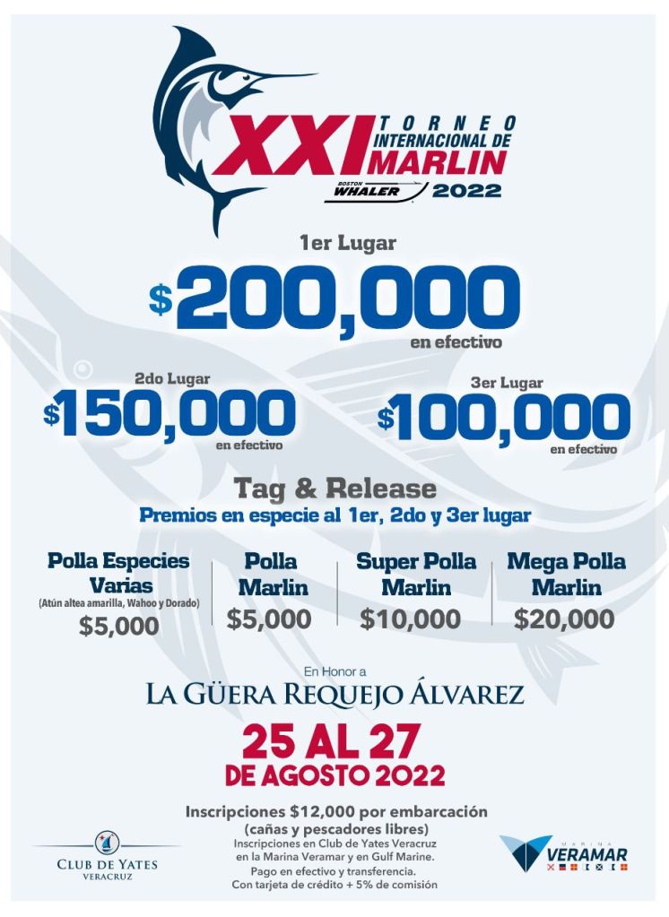 Para mayores informes sobre la edición #21 del Torneo Internacional del Marlín “Boston Whaler 2022”, el Club de Yates Veracruz invita a los participantes a solicitar informes en Marina Veramar.