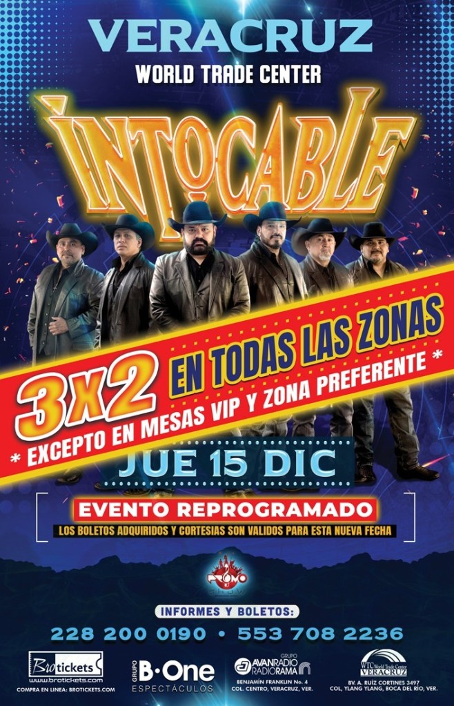 Tras haberse pospuesto por tema de salud, Grupo Intocable reprograma su fecha para Veracruz y será el jueves 15 de diciembre, en el mismo lugar, WTC y misma hora, 9 de la noches.