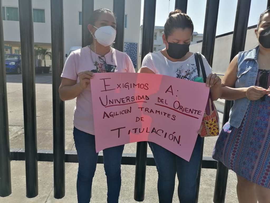 Medellín de Bravo, Ver.- Estudiantes de la primera generación de la maestría de Administración de los Servicios de Salud, se manifestaron la tarde de este viernes a las afueras de la Universidad de Oriente (UO), pues acusan que, llevan más de dos años luchando por que les entreguen sus títulos.