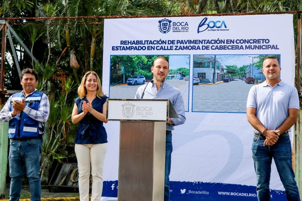 “No se puede hablar del desarrollo de Boca del Río, sin hablar de su cabecera municipal”, por ello la importancia del banderazo de obra de la pavimentación en concreto estampado de la calle Zamora entre la Avenida Revolución y la Avenida Veracruz.