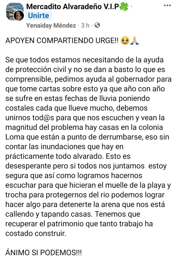 Alvarado, Ver.- A través de redes sociales los ciudadanos de las colonias de la cabecera municipal de Alvarado claman el apoyo del Gobierno del Estado, tras la inundación sufrida la tarde de este viernes.