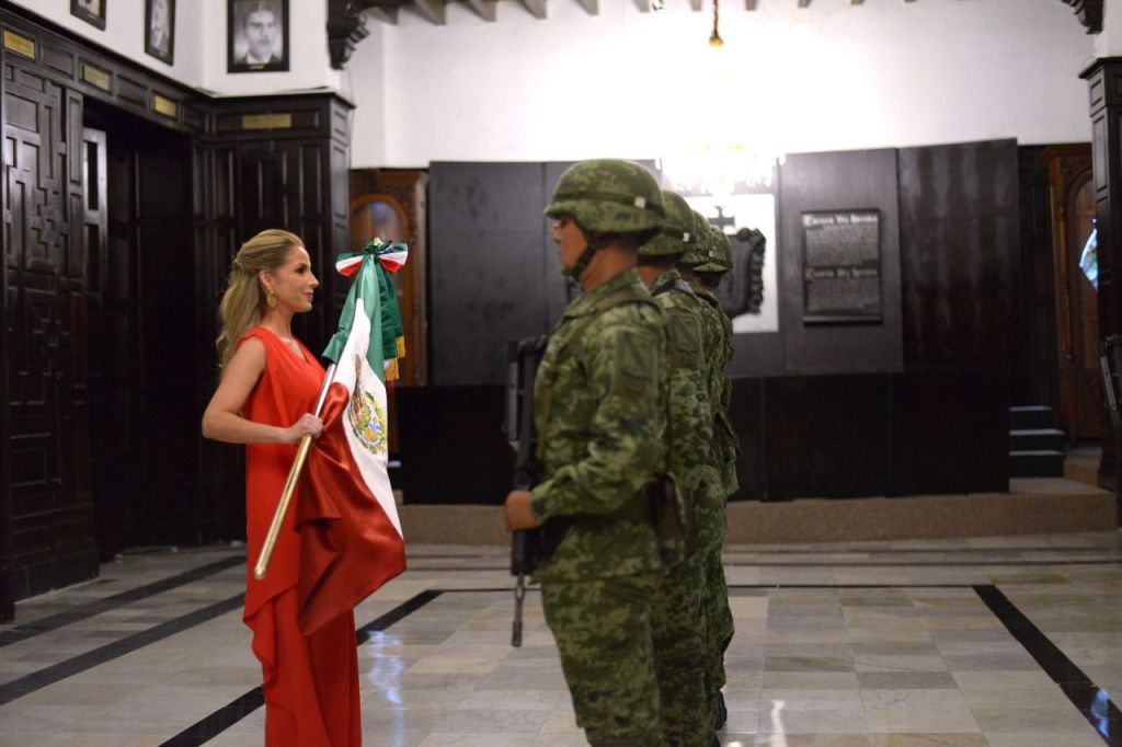 Para las 22:55, la escolta militar de la Secretaría de la Defensa Nacional inició el recorrido por los pasillos centrales del Palacio Municipal con la Bandera Nacional hacia la Sala de Cabildo.