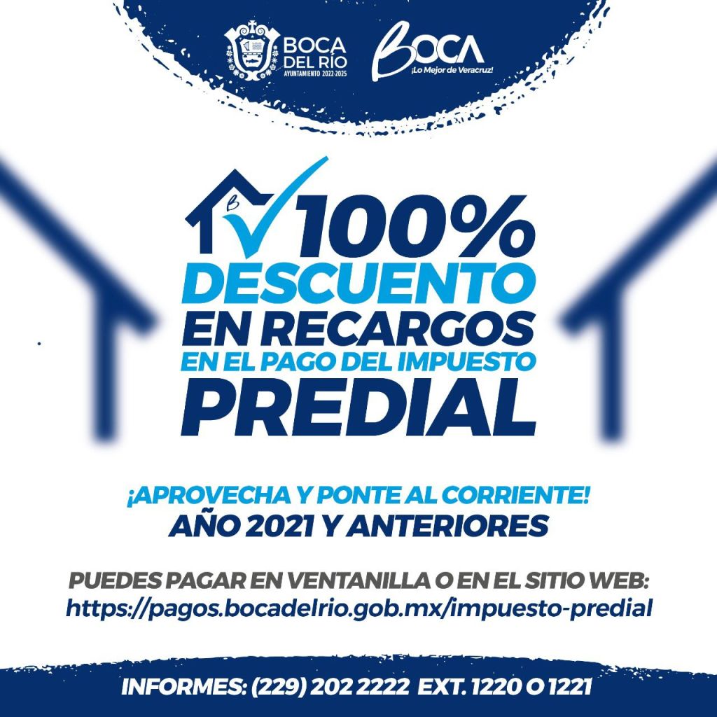 También puede visitar la página y realizar su pago en línea en https://pagos.bocadelrio.gob.mx/impuesto-prediall; si tiene alguna duda se puede comunicar para solicitar informes al (229) 2022222 ext. 1220 o 1221.