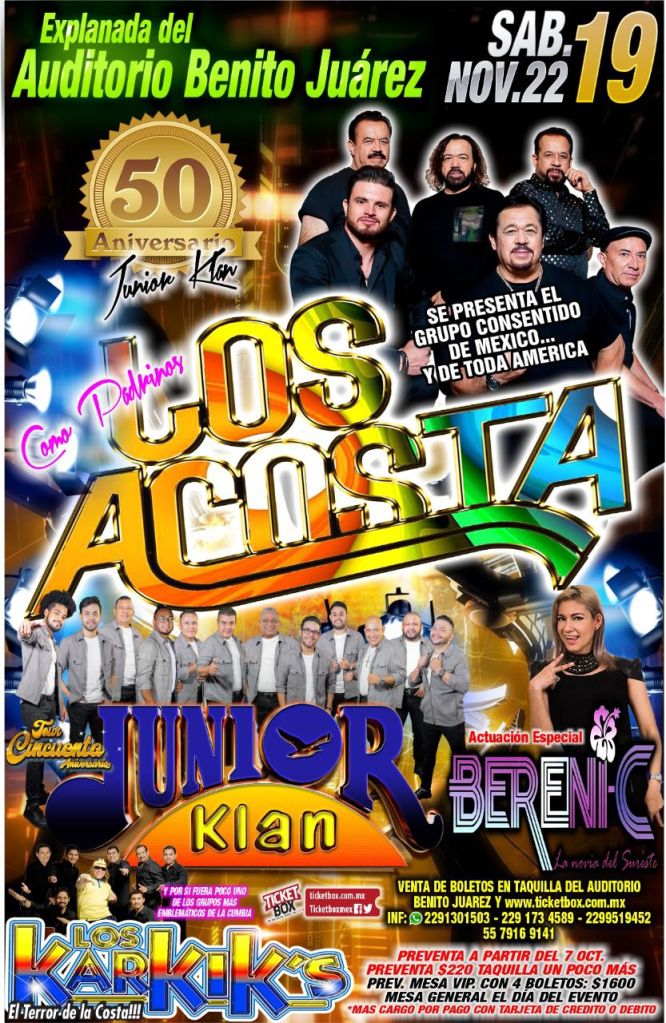 Y es que la fiesta de los 50 años de Junior Klan estará a lo grande pues tendrá como padrinos de lujo el grupo consentido de México, Los Acosta, y por primera vez en Veracruz Los Karkik´s, así como la actuación especial de BereniC “La novia del Sureste”.