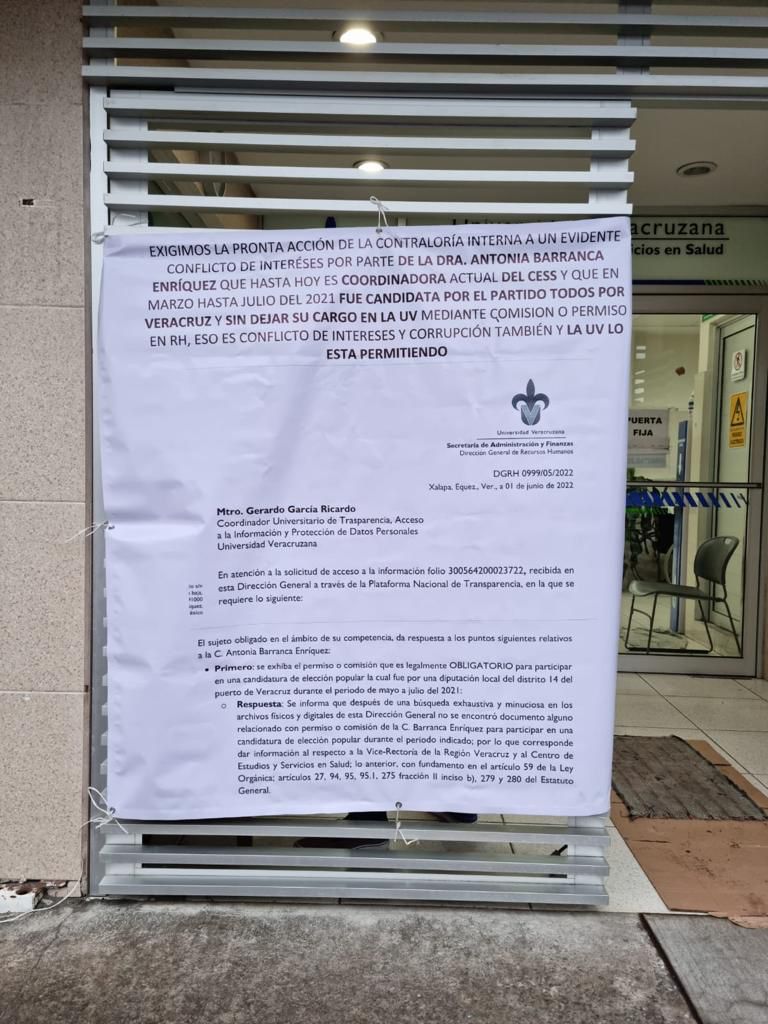 Colectivo de profesores colocaron mantas afuera de la Facultad de Bioanalisis de la Universidad Veracruzana e impidieron el paso de los estudiantes la mañana de este miércoles; argumentan que Antonia Barranca continuaba fungiendo en el cargo de directora del Centro de Estudios y Servicios en Salud durante su participación como aspirante a diputada.