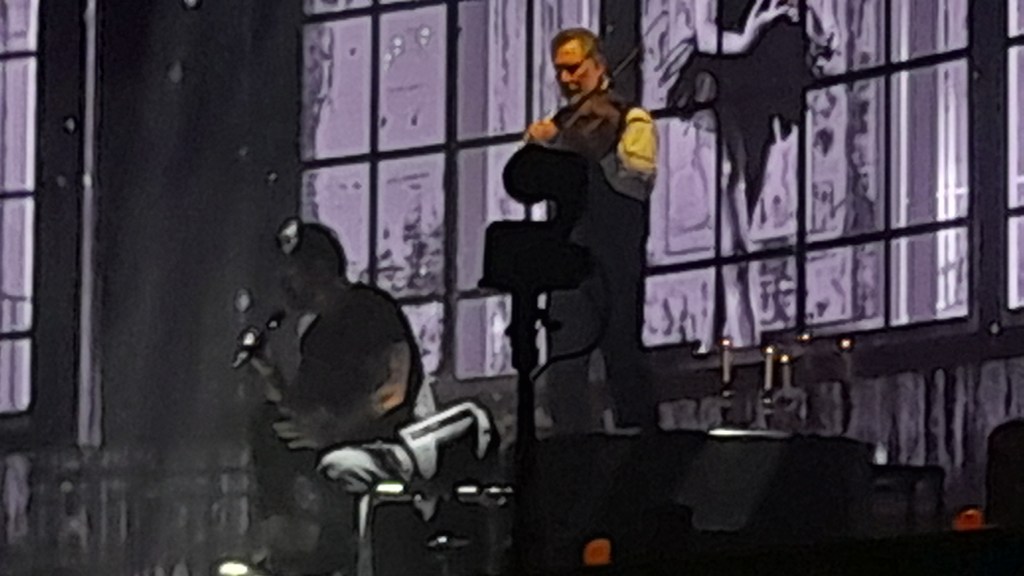 Cuando se prendieron las luces del escenario aparecio un coro espectacular y su público se desbordó en plausos cuando sonó el primer tema «Si yo fuera diputado» con un Ricardo Arjona sonriente y vestido de negro.