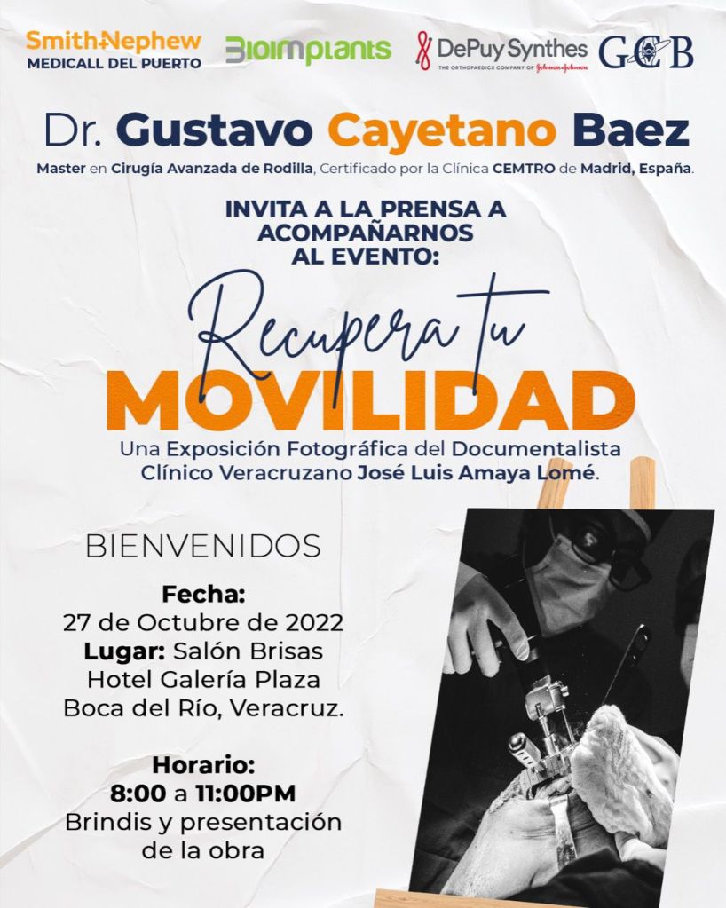 Es el doctor Gustavo Cayetano Báez, Master en Patología y Cirugía avanzada de rodilla quien presenta “Recupera tu movilidad”, una exposición fotográfica del documentalista clínico veracruzano José Luis Amaya Lomé.
