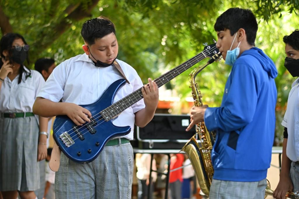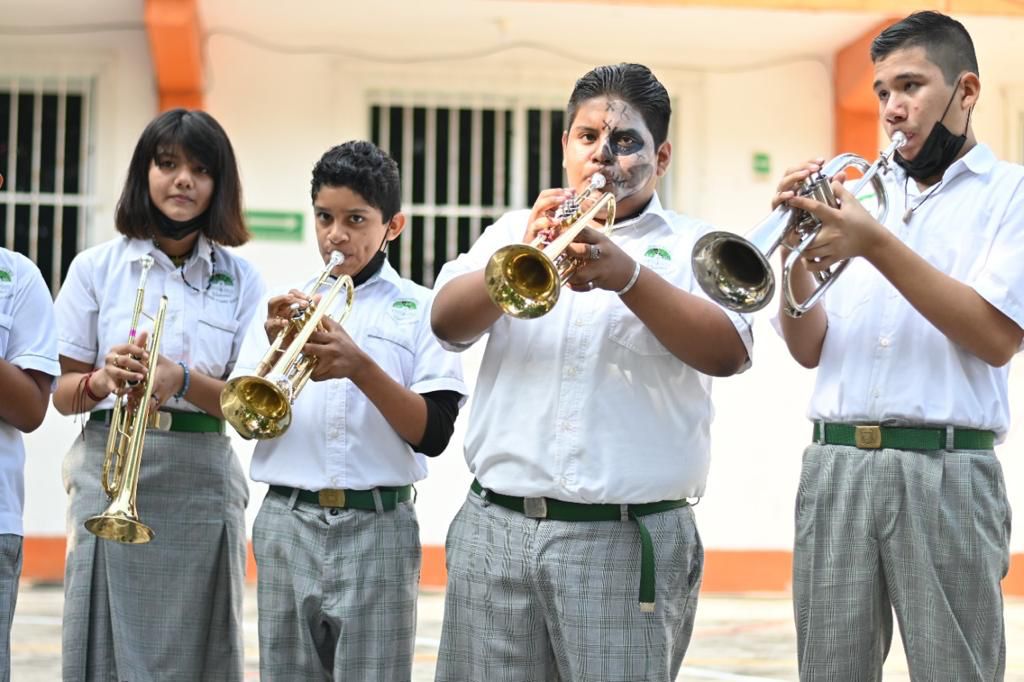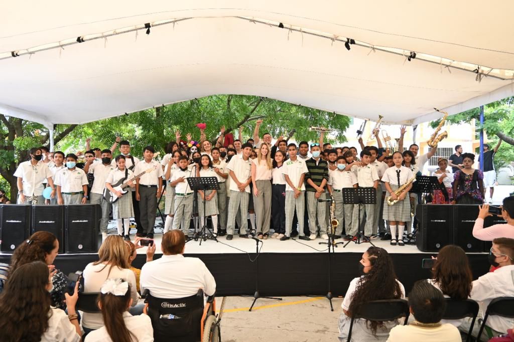 *Veracruz, Ver., 31 de octubre de 2022.-* Al asistir a la presentación del Ensamble de Orquestando Cumbia en la escuela telesecundaria Ricardo Flores Magón de la colonia Miguel Hidalgo, la alcaldesa Patricia Lobeira de Yunes resaltó la importancia de este programa que tiene como objetivo motivar e involucrar a los niños, adolescentes y jóvenes en algo productivo como es la música, y de esta forma prevenir el delito.