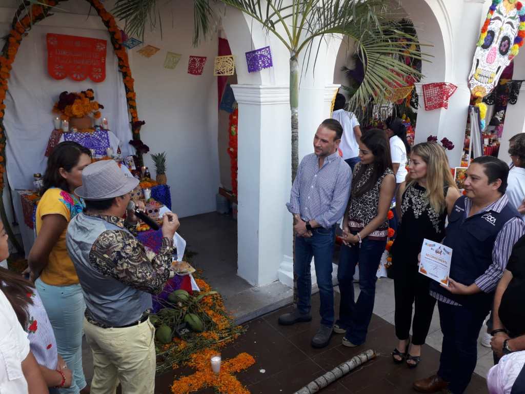 Alcalde de Boca del Río Juan Manuel Unanue ,la presidenta del DIF Municipal, Melina Rivera de Unánue ,invitados y demás integrantes del ayuntamiento inauguraron la exposición de altares al interior del Ayuntamiento.