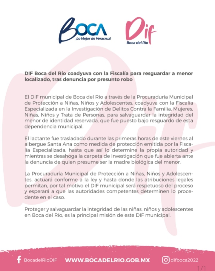 El DIF municipal de Boca del Río a través de la Procuraduría Municipal de Protección a Niñas, Niños y Adolescentes, coadyuva con la Fiscalía Especializada en la Investigación de Delitos Contra la Familia, Mujeres, Niñas, Niños y Trata de Personas, para salvaguardar la integridad del menor de identidad reservada, que fue puesto bajo resguardo de esta dependencia municipal.