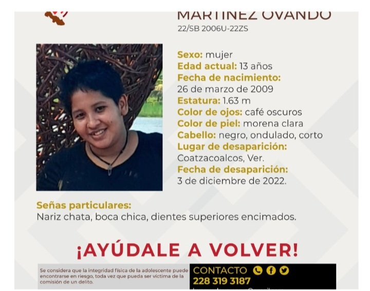 Yesenia Lilian Martínez Ovando, una menor de 13 años, fue localizada sin vida en un lote baldío en el Puerto de Coatzacoalcos, al sur de Veracruz, tras haber sido reportada como desaparecida el 3 de diciembre. La niña había salido de su casa a la tienda pero nunca regresó. Ayer la policía recibió el reporte de un cuerpo abandonado en un lote baldío ubicado sobre la calle Faisanes, de la colonia Santa Isabel II.