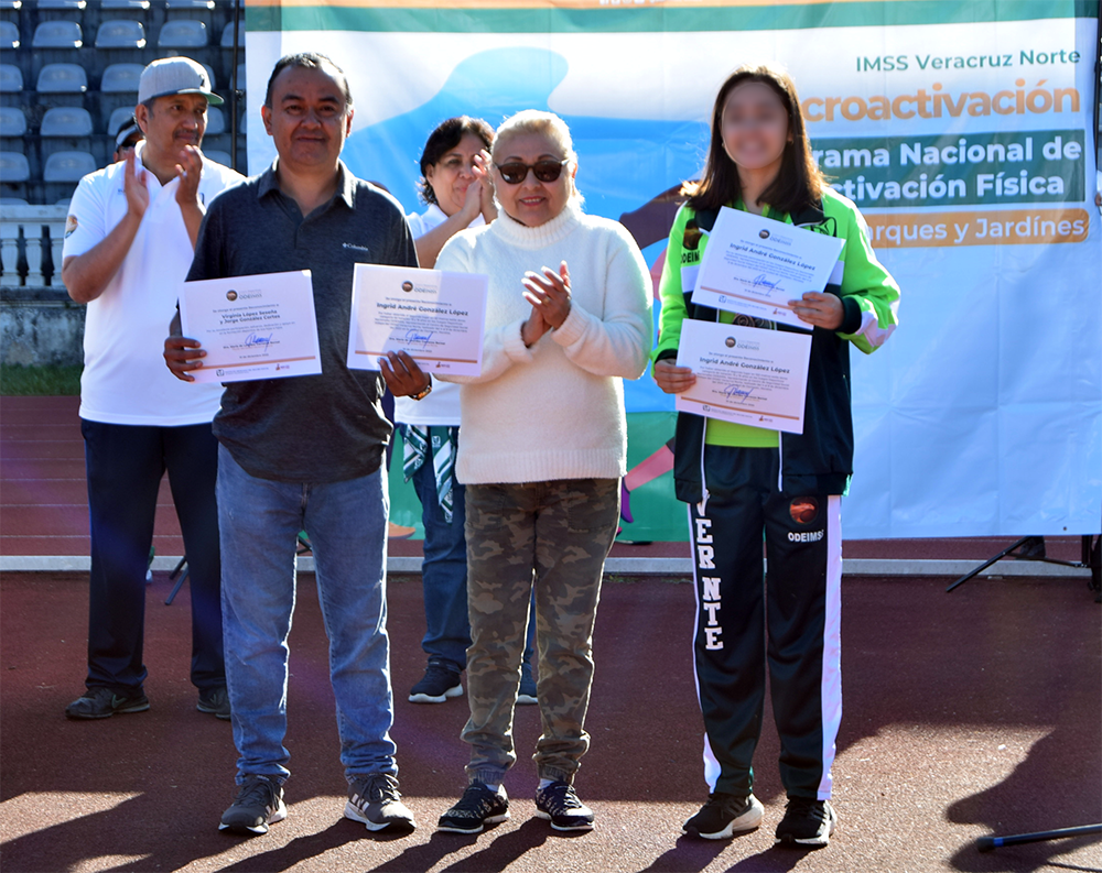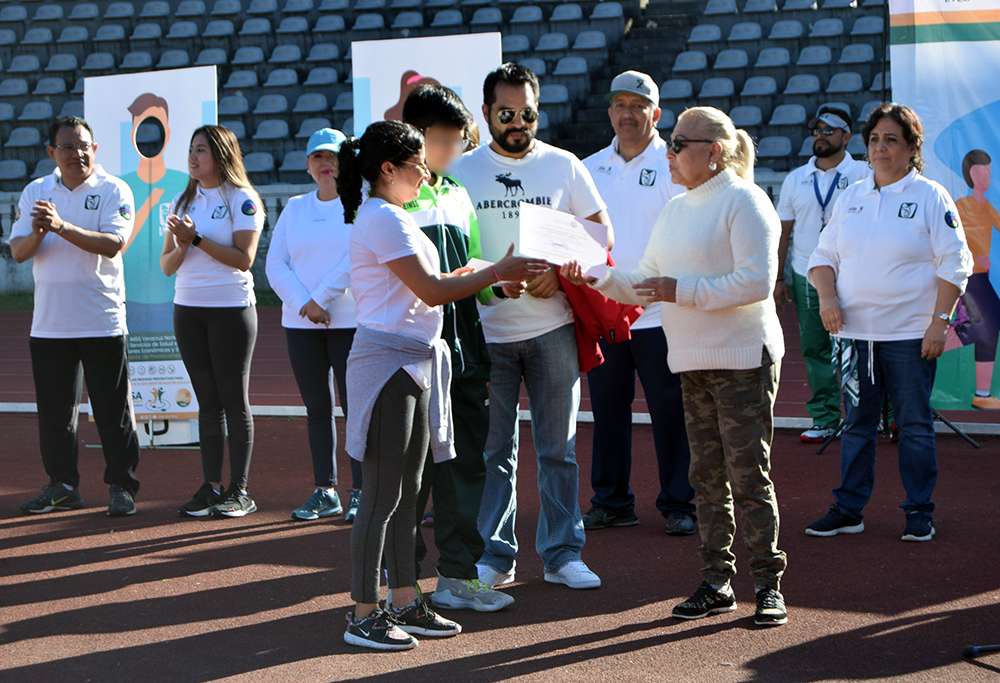 Durante la macroactivación del programa “Activación Física en Parques y Jardines”, que se llevó a cabo en el estadio Heriberto Jara Corona, la titular del IMSS en Veracruz Norte, doctora María de Lourdes Carranza Bernal, entregó reconocimientos a alumnos y entrenadores en los “II Juegos Nacionales Deportivos ODEIMSS 2022”.