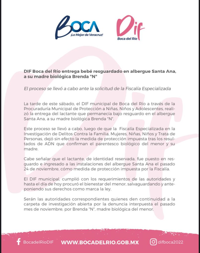 La tarde de este sábado, el DIF municipal de Boca del Río a través de la Procuraduría Municipal de Protección a Niñas, Niños y Adolescentes, realizó la entrega del lactante que permanecía bajo resguardo en el albergue Santa Ana, a su madre biológica Brenda «N».