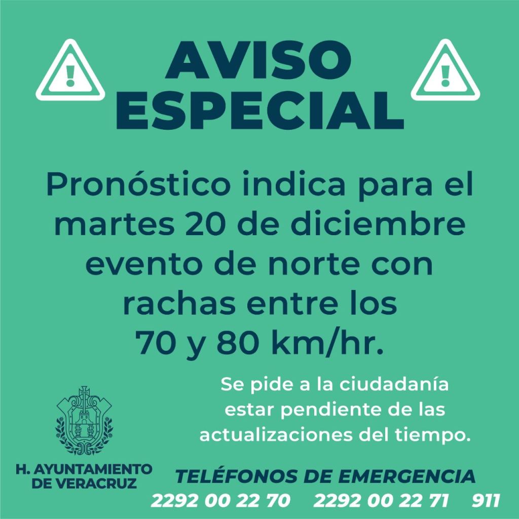 El Gobierno Municipal de Veracruz, a través de la Unidad de Protección Civil, emite aviso especial por evento de norte para el día martes 20 de diciembre.