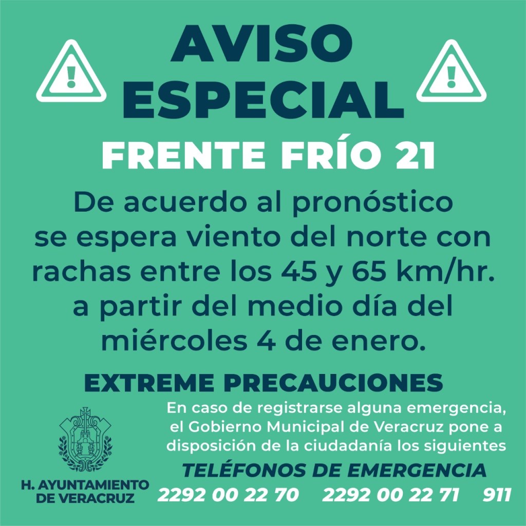 _-Veracruz, Ver., 03 de enero de 2023.-* El Gobierno Municipal de Veracruz, a través de la Unidad de Protección Civil, emite aviso especial por el Frente Frío No. 21 en el Puerto de Veracruz.