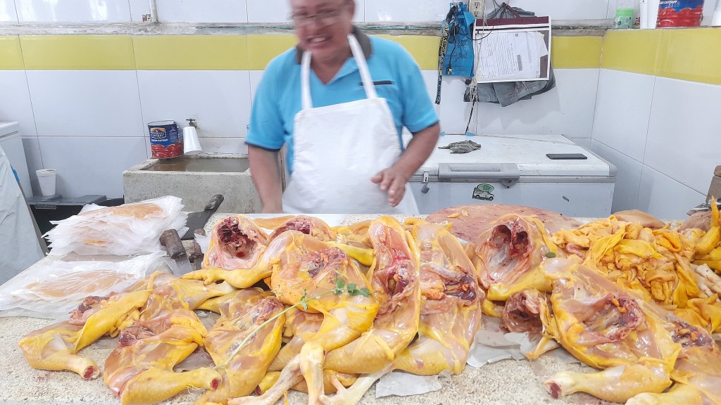 «Las ventas bajaron muchísimo, aquí vendemos por pieza, deja más por kilo pero no nos dejan vender por kilo, según el tamaño es el precio, mataba 50 pollos, pero ahorita estoy matando 10 pollos, porque el que compraba 2 pollos ya solo se lleva uno, está muy difícil la situación».