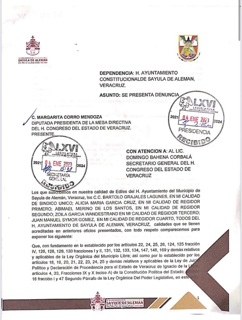 Veracruz, Ver.- El Síndico y los cuatro regidores que integran el Cabildo de Sayula de Alemán, solicitaron al Congreso del Estado iniciar procedimiento de disolución de poderes en ese municipio ante el gran número de omisiones y delitos que está cometiendo la alcaldesa Lorena Sánchez Vargas.