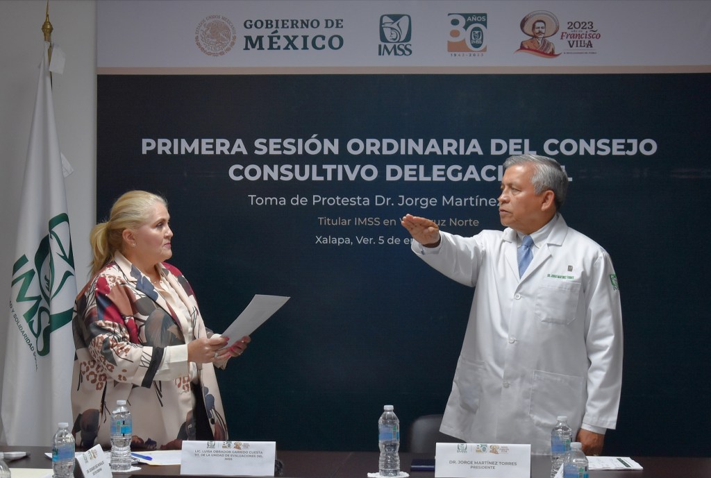 En la Primera Sesión Ordinaria del H. Consejo Consultivo del Instituto Mexicano del Seguro Social (IMSS), la titular de la Unidad de Evaluación de Órganos Desconcentrados, licenciada Luisa Alejandra Guadalupe Obrador Garrido Cuesta, tomó protesta al nuevo titular de la representación regional en Veracruz Norte, el doctor Jorge Martínez Torres, cuyo compromiso es el de trabajar en el fortalecimiento de la atención de los derechohabientes.