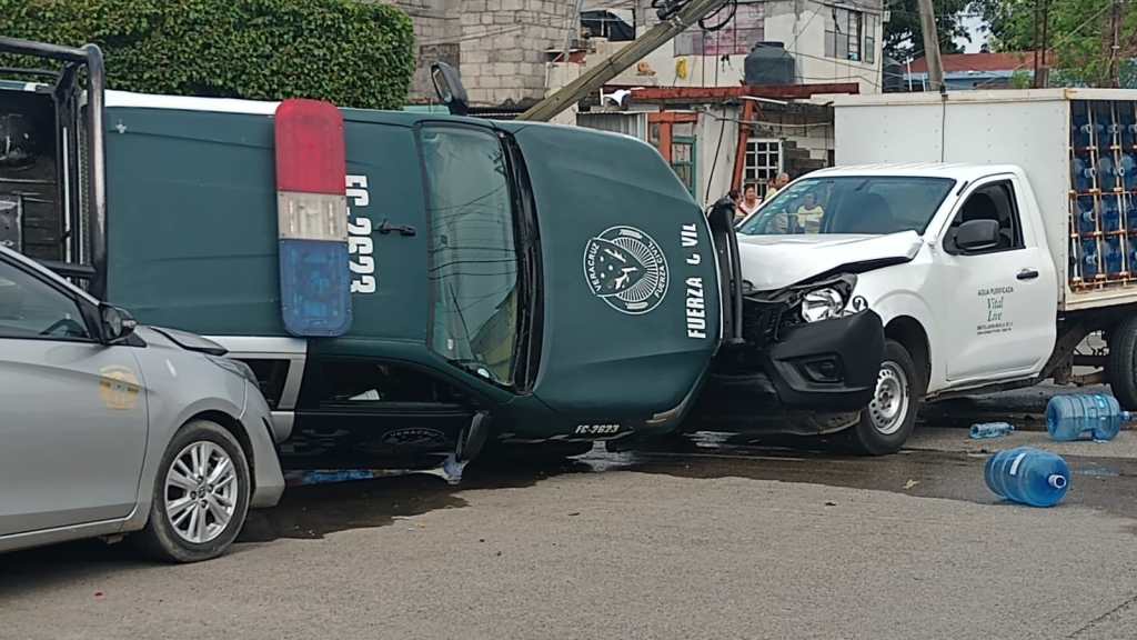 Según menciona el peritaje, la camioneta repartidora de agua y perteneciente a la empresa Vital Live, no logró hacer el alto total en la esquina, por lo que se impactó en contra de la patrulla de Fuerza Civil, quién a su vez chocó contra un poste de telefonía y un automóvil estacionado.