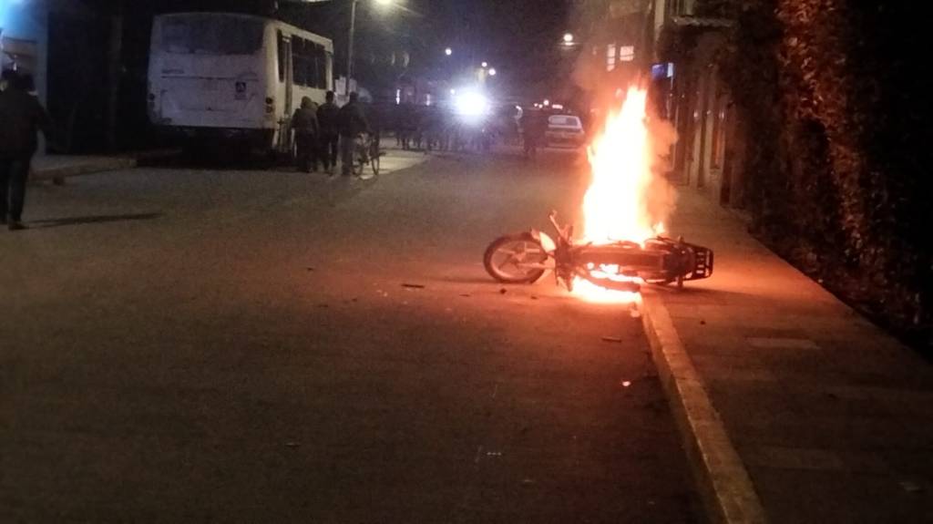 Durante la pacífica manifestación de los ciudadanos apareció un pequeño grupo armado que disparo en contra de la Comandancia de Policía que se encuentra en los bajos del Palacio Municipal, entre la revuelta, aprovecharon para robar una moto patrulla, la cual incendiaron en la avenida Benito Juárez en el centro de la ciudad.