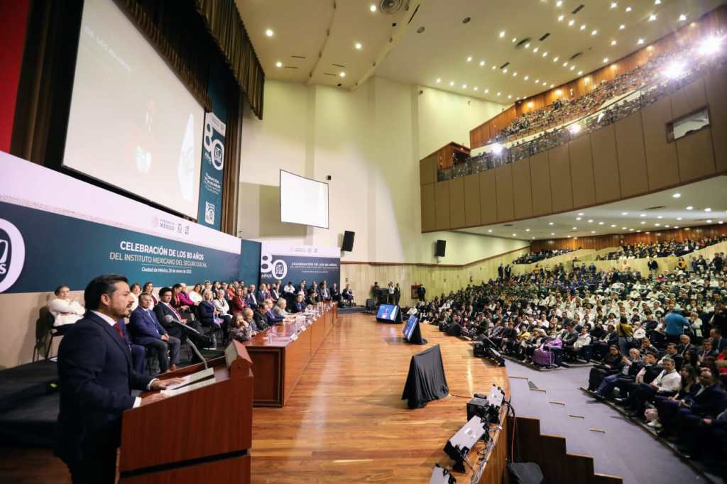 Durante el evento de conmemoración de los 80 años del Instituto, realizado en la Unidad de Congresos del Centro Médico Nacional (CMN) Siglo XXI, el director general señaló que el IMSS surgió́ de la Revolución Mexicana y hoy acude al llamado histórico de contribuir a los propósitos de la cuarta transformación de proteger a los mexicanos en los momentos de incertidumbre y de enfermedad, con el mensaje del derecho a la salud y a la felicidad.