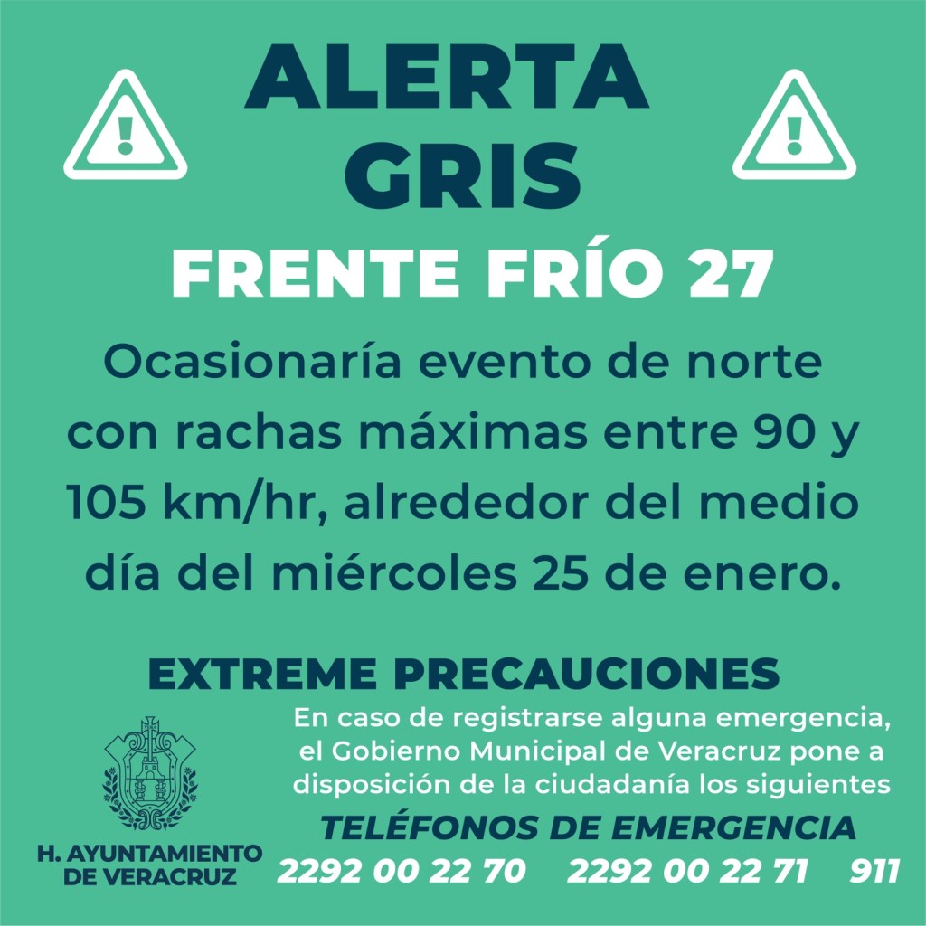 *Veracruz, Ver., 24 de enero de 2023.-* El Gobierno Municipal de Veracruz, a través de la Unidad de Protección Civil, informa sobre la Alerta Gris por el Frente Frío No. 27 en el Puerto de Veracruz para el día de mañana miércoles 25 de enero.