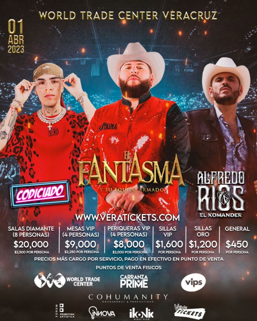 Veracruz, Ver. Enero 2023.- El concierto de banda más importante del momento llega a Veracruz reuniendo en un mismo escenario a tres generaciones: Alfredo Ríos “El Komander”; Alexander García “El Fantasma” y su equipo Armado y Erick Aragón “Codiciado”.