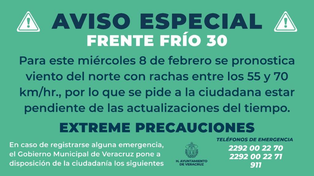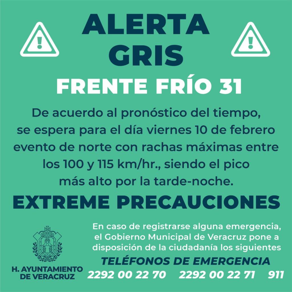 *-Veracruz, Ver., 08 de febrero de 2023.-* El Gobierno Municipal de Veracruz, a través de la Unidad de Protección Civil, emite alerta gris por la entrada del Frente frío No. 31 en el Puerto de Veracruz.