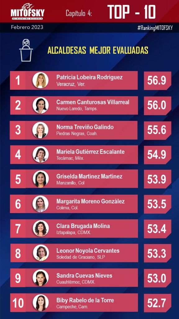 *Veracruz, Ver., 27 de febrero de 2023.-* La primera encuesta de Mitofsky de este 2023, sitúa a la alcaldesa Paty Lobeira de Yunes como la mejor calificada de todo el país, lo que refleja una gran aceptación de los veracruzanos al trabajo, políticas públicas, obras, acciones y decisiones que ha ejecutado durante su primer año de gobierno municipal.