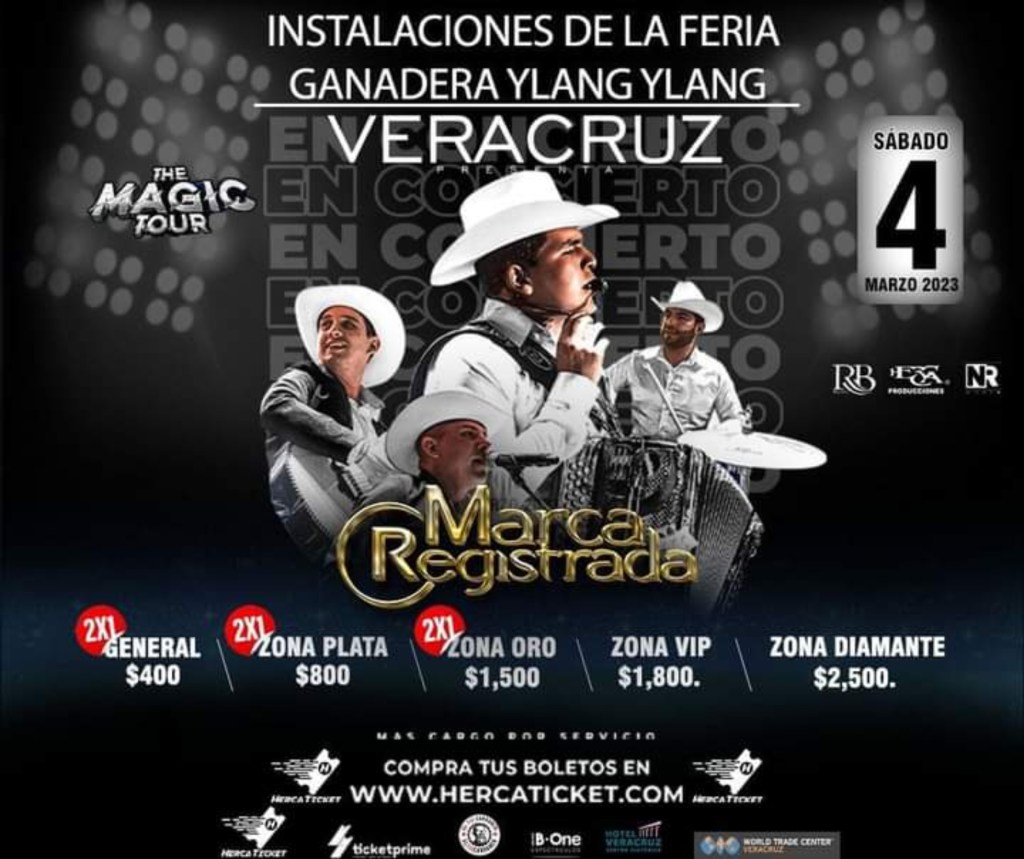 Veracruz, Ver. Marzo 2023.- Herca Producciones informa a la ciudadanía en general y a quienes han adquirido boletos de entradas para el concierto del Grupo Marca Registrada, que éste cambia de sede, llevándose a cabo ahora en las instalaciones de la Ganadera de Ylang Ylang, mismo día y misma hora.