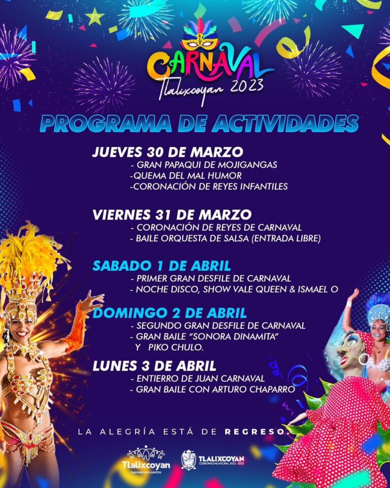 El viernes 31 de marzo será la coronación de los Reyes del Carnaval de Tlalixcoyan 2023, a las 9 de la noche pero además habrá baile de salsa a las 11 de la noche y la entrada será libre.