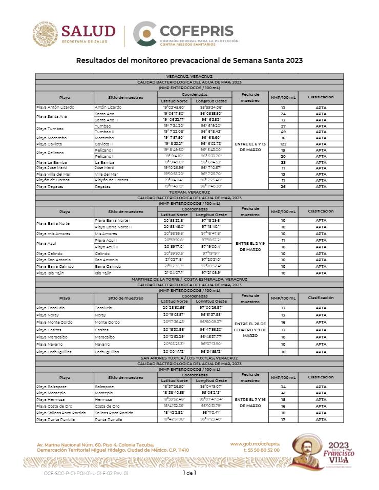 Veracruz, Ver.- Previo a la temporada vacacional de Semana Santa, la Comisión Federal para la Protección contra Riesgos Sanitarios (COFEPRIS) presentó un informe sobre la contaminación de playas; dónde se puntualiza que las 31 playas de la entidad veracruzana se encuentran aptas para la visita de turistas.