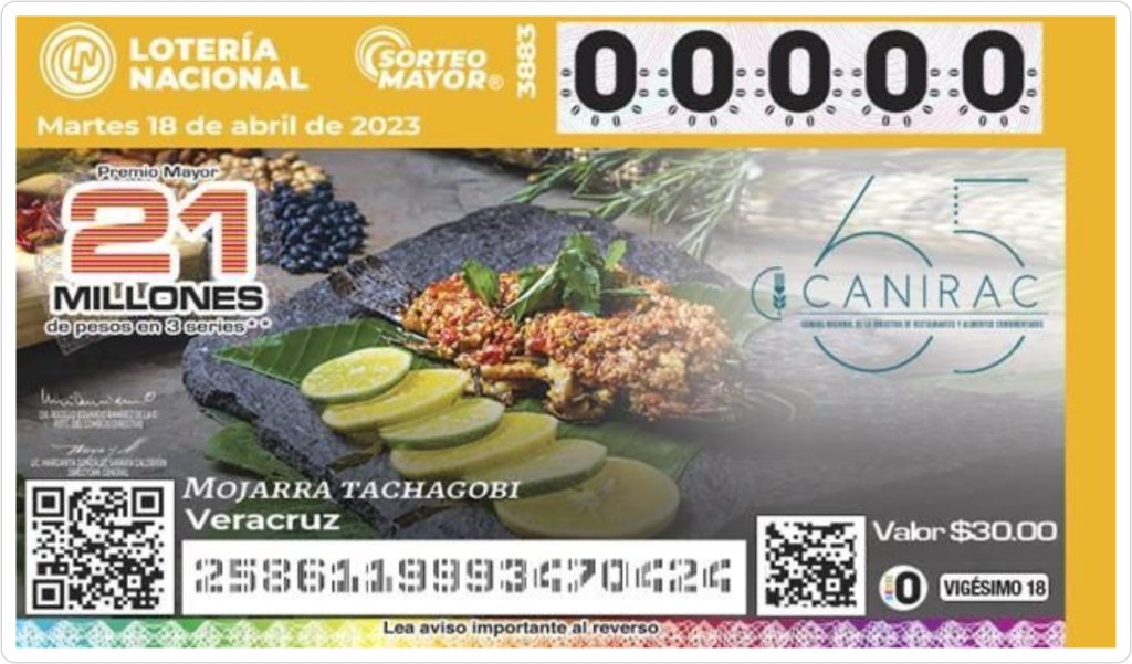 Xalapa, Ver.- Con el platillo mojarra en tachogobi de la región de Los Tuxtlas, la Lotería Nacional celebra el Sorteo Mayor número 3883 que conmemora el 65 aniversario de la Cámara Nacional de la Industria de Restaurantes y Alimentos Condimentados (CANIRAC).