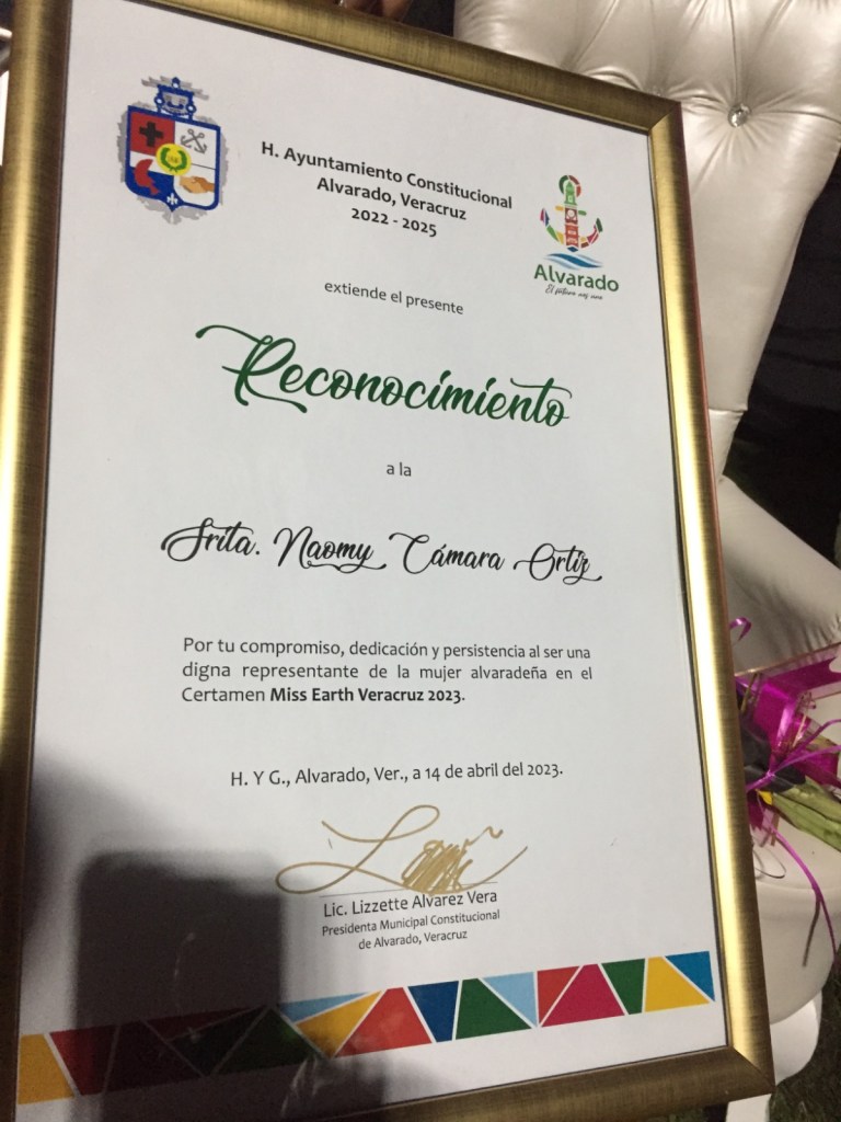 “Por tu compromiso, dedicación y persistencia al ser una digna representante de la mujer alvaradeña en el certamen Miss Earth Veracruz 2023”, precisa el reconocimiento.