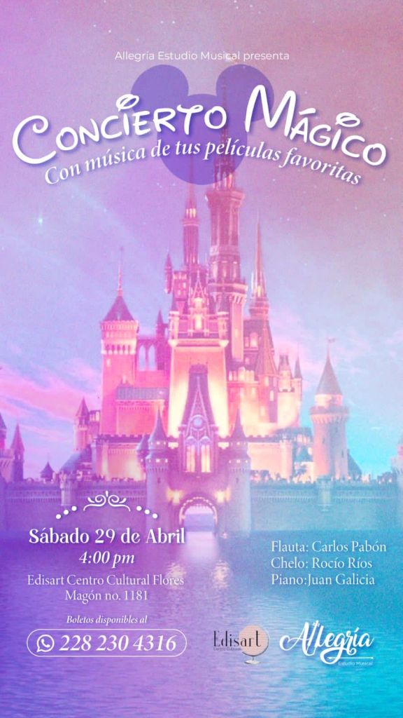 Los maestros Juan Galicia, al piano; Rocío Ríos, en el chelo, y Carlos Pabón, en la flauta, interpretarán la música de La Sirenita, Moana, Encanto, Toy Story, Frozen, Pocahontas, Mulan, Up, entre otras obras musicales más.