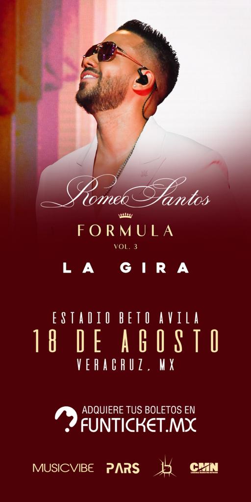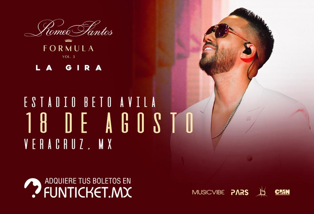 Veracruz, Ver. Mayo 2023.- Tras 5 años de ausencia en los escenarios mexicanos, el artista neoyorkino Romeo Santos realizará una serie de presentaciones en nuestro país, siendo Veracruz una de las plazas donde llegará con su tour “Fórmula Vol. 3” el próximo 18 de agosto en el estadio de béisbol “Beto Ávila”.