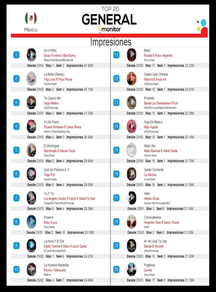 “un X100to” continúa rompiendo récords y se coloca por segunda semana consecutiva en el número uno del chart general de audiencia en México.